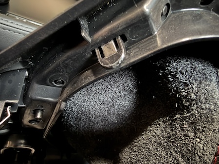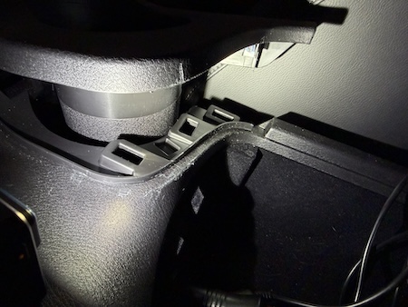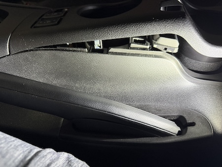 6. Once you can fit your fingertips under the molding you can gently lift it up, releasing the clips around the edges as you go. Do not lift it very far because underneath are the wires connected to the Start and S-Mode buttons. You don't need to disconnect these wires if you are careful not to jerk them as do the next steps. |