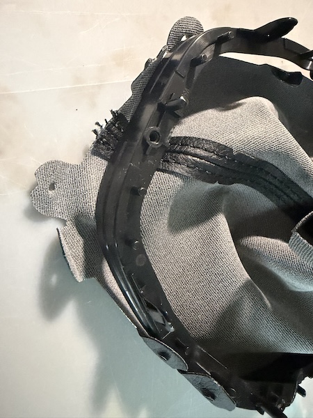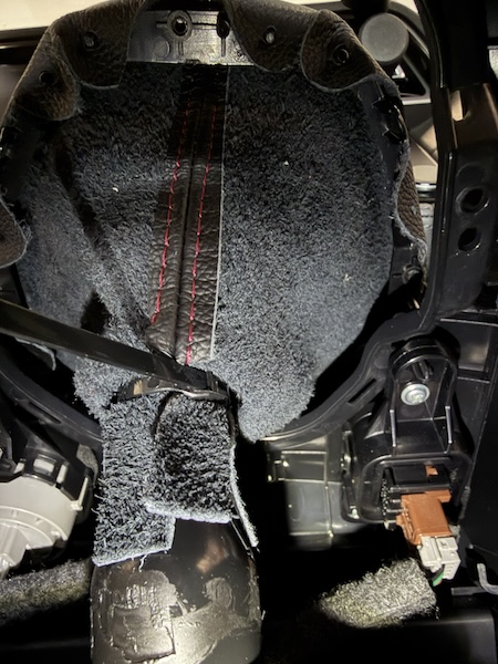 9. Reverse steps to install your new custom boot to the plastic ring, by wrapping the tabs around and slipping them over the plastic spikes. Push the boot-wrapped ring back into the molding, using your fingers or a pry tool to carefully ensure the boot doesn't bunch up as you slide the ring back into place. It's a snug fit but you can gently pull the boot from underneath as you slide the ring into place, so it doesn't bunch around the edges. Once the ring is seated in place, squeeze the pieces together until the four plastic tabs catch. Inspect the boot to make sure the leather is smooth and snug as you want it. Secure the ring back into place in the molding with the silver screws. Use a new ziptie to secure the tabs of your new boot to the stalk by pulling the leather tabs through and then cinching them tightly to the ring. |
