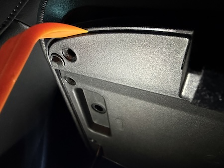 13. There are four plastic clips at the bottom inside of the cover so be careful not to snap them off. As you gently pull away the cover you will be able to slip your tool into each of the slots at the bottom corners where these clips are to release them without breaking them off. |