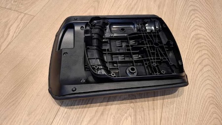11. Open the console and remove the seven black metal screws and the one black plastic screw. |