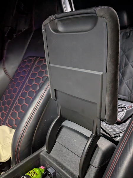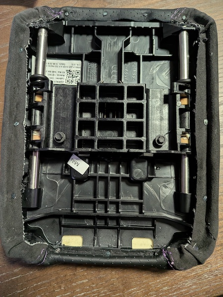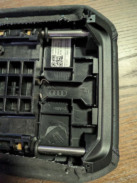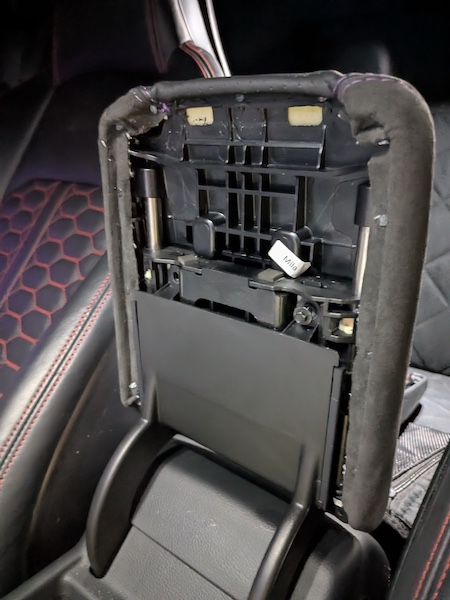 1. Open the armrest, slide it toward to reveal the screws and remove them to take the armrest out of the vehicle. Pry off both plastic panels (they are simply pressure fit into the armrest). Place pad and console into the new leather cover. Center the seams first, then tack the front and back into place. Pictured here was install via nail gun, but you can use glue or staples to adhere the cover to the armrest.