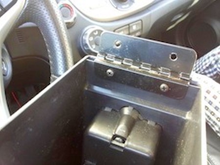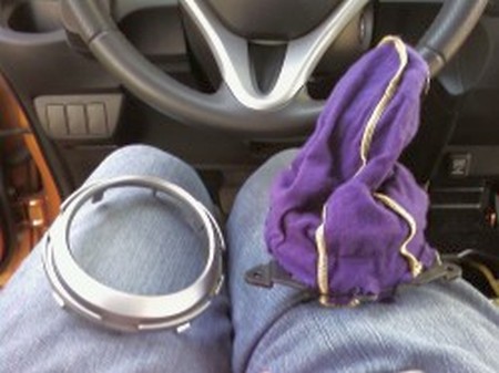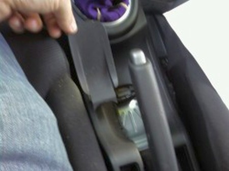 3. Remove the little cover under the E-Brake handle I used a small flat head screw driver to apply force between the front of the E-brake handle and the back of the cover it too will simply pop out. |