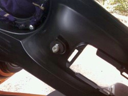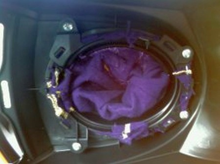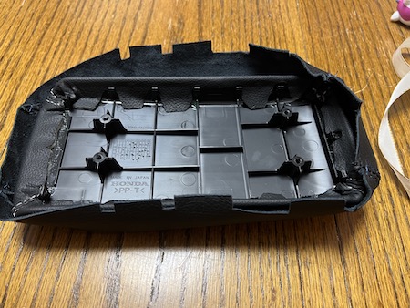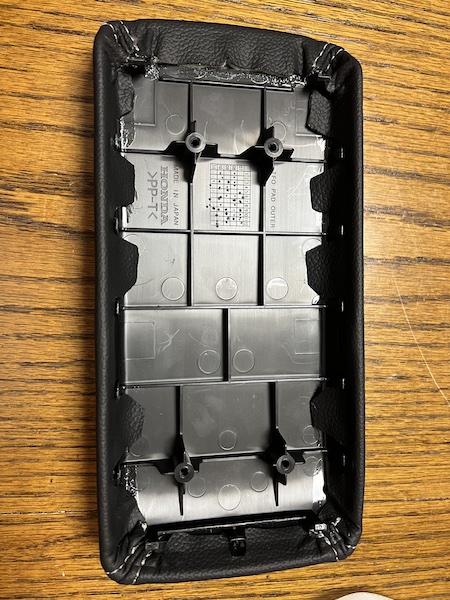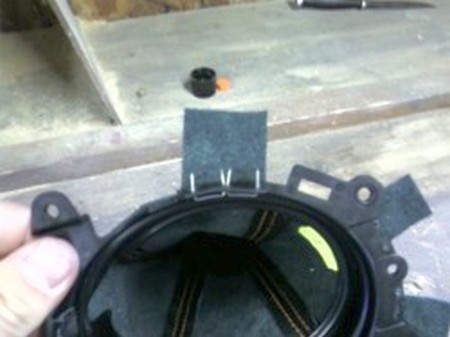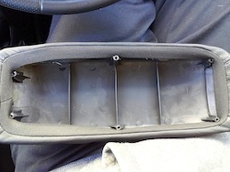 26. Once the leather in on the armrest, place the bottom plastic cover but making sure to tuck the stretch band as shown in the picture so you don't screw in the band and have the lid lopsided when closed. |