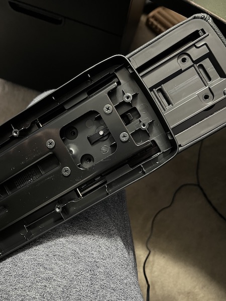 24. Now with the top portion off, unscrew the four screws under the armrest and remove that plastic bottom cover. |