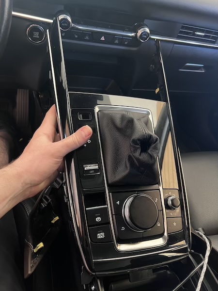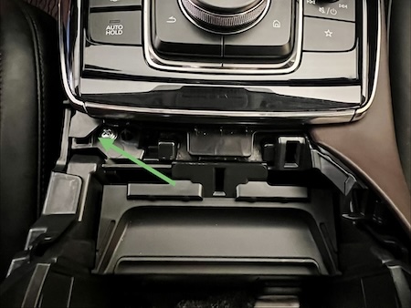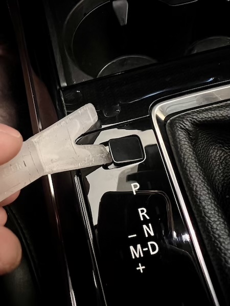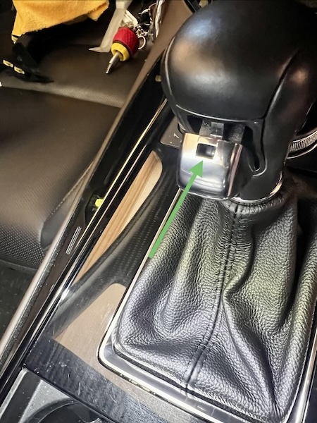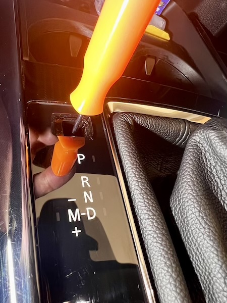 7. Remove shift knob button by gently pulling button to the front of the vehicle so that the access point is visible. Use a small pry tool to press the locking tab, allowing the button cover to slide forward, exposing the metal retention clip. |