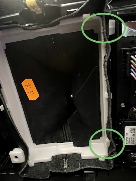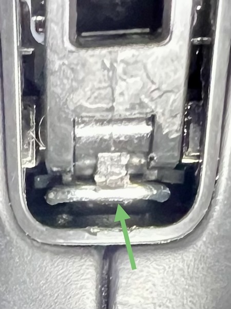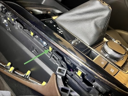 8. Use a small pick to pull the metal retention clip toward the front of the vehicle. Be careful not to damage the plastic tab above it or the outer plastic surround. |