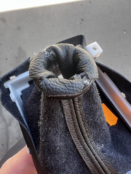 14. Gently remove the shift boot and plastic retention ring assembly. Remove the plastic ring at the top of the shift boot, paying attention to the position. This ring will need to be installed in the new shift boot in the same orientation with super glue. |